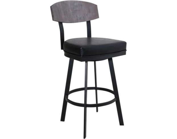 This adorable mid-century modern barstool is perfect if you’re looking to add a little additional seating to your home. This stool features a matte black finish, a vintage faux black leather seat, a convenient, round footrest and a subtly rounded wooden back. The dark finish of this unique piece makes it perfect for any palette.