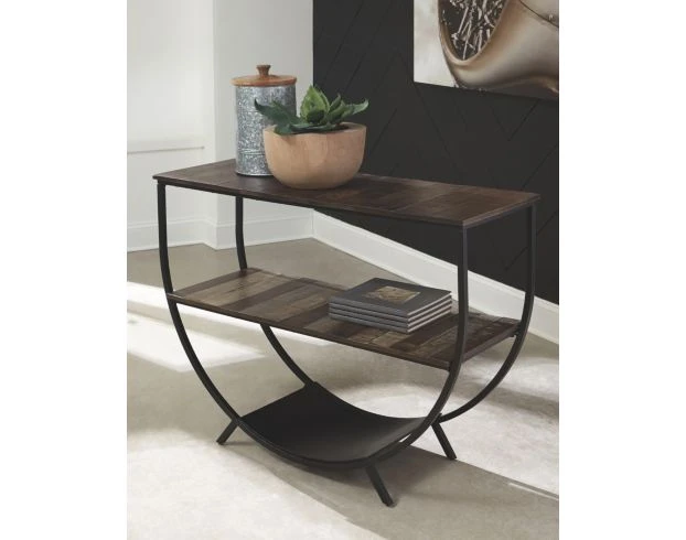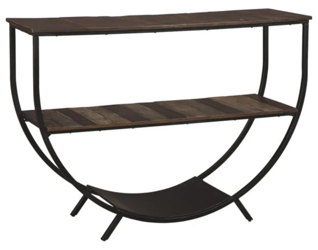 Add style and function to your space with the Ashley Accents Console. It features two fixed wood shelves and a sleek black frame. The natural wood and black fit seamlessly with any casual space. Location 8F