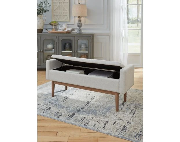 Blend contemporary style with comfort to get this storage bench. Its hinged seat reveals a hidden storage area that’s perfect for storing extra pillows and offers a high-end look. Fall in love with its cream upholstery paired with a tufted cushioned seat that suits any neutral color palette.