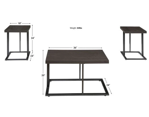 Enjoy sleek style and convenient functionality with this modern set of tables, including a coffee table that measures 36″ w x 24″ d x 20″ h and two end tables that are 18″ w x 24″ d x 24″ h. The design features clean angles, tubular metal legs and pine veneer surfaces. Add modern appeal to any contemporary space with the boxy lines, aged bronze metal frames and graphite finish. LOC: 9C, 8F