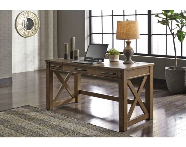Rustic design meets productivity with the Aldwin collection. This stylish desk features pine veneers, a distressed gray finish, a cross-buck designed legs, two USB charging ports, smooth gliding drawers and a lift-top. The gray wood tones of this piece is perfect for any rustic palette.