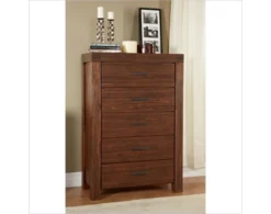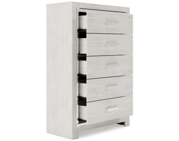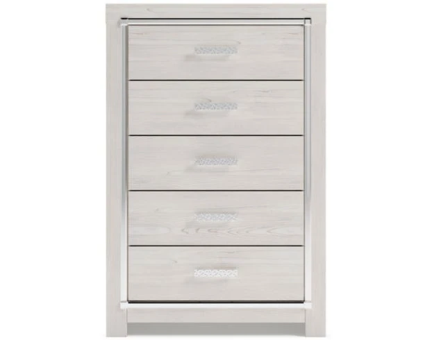 With a subtle hint of glam, this chest brings both style and function to your bedroom. It features a fashion-forward design with its clean lines, light finish with pearl effect, and large chrome-tone handles with mosaic details. The five smooth-gliding drawers offer optimal storage space for bedroom essentials. Packed with possibilities, this chest enhances any beautiful contemporary space.