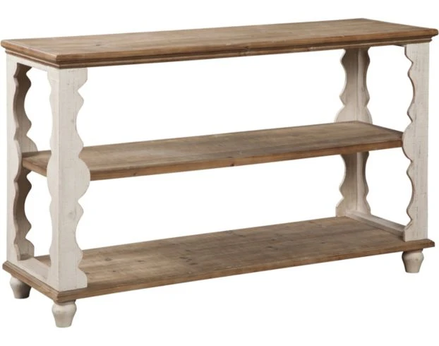 Give your home a pop of charm and casual style with the Ashley Alwyndale Console Table. The impressive piece features a solid wood constriction with natural and antiqued white finishes. The scalloped woodwork and two fixed shelves add both beauty and function to your space. Location: 3F