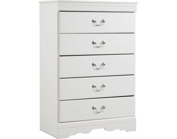 Enjoy classic Louis Philippe styling at a great price with this chest of drawers. It features gorgeous top molding, a shapely base rail and five spacious drawers with smooth roller glides. The crisp, white finish and pewter-color hardware offer an updated take on a classic design. LOC: 11I