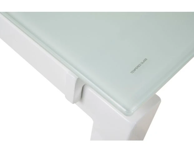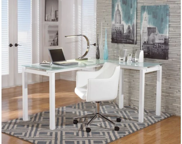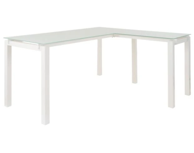 Create a stylish home office space with this sleek desk. The L-shaped design features a sturdy, tempered glass top and a welded metal frame. The white powder coat finish highlights the clean lines, providing the perfect look for any contemporary space. Additional features include: Welded metal frame, white powder coat finish, tempered glass top.
