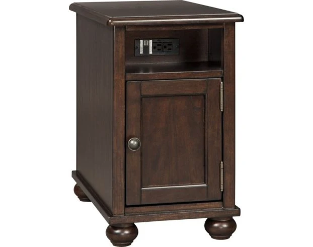 Enjoy timeless style and function with this chairside table. Constructed of hardwood solids and Mindi veneers, it features enclosed storage space and an open shelf with two USB charging ports and electrical outlets. Add charm to your home with the bun feet, bronze hardware and rich finish. LOC: 7F