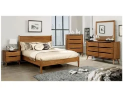 This fashionable queen panel bedroom set includes a queen size bed, dresser, mirror and nightstand. These exquisite pieces feature a smokey gray finish over replicated Oak grain, contemporary gunmetal finished hardware and slide roller glides for smooth, functional drawers. The nightstand has a slim USB charger located on its backside. The natural hue of this set is perfect for any casual palette.