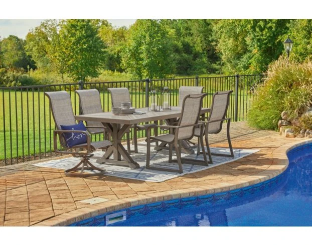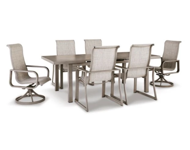 Balancing effortless natural beauty and minimalist design, this dining set seamlessly brings your contemporary style outdoors. Sporting a wood-look finish, the easy-to-operate extension features on the stainless-steel table. Combined with the 6 chairs, 2 swivel and 4 dining. This sleek yet durably made set refines the art of relaxed outdoor living.