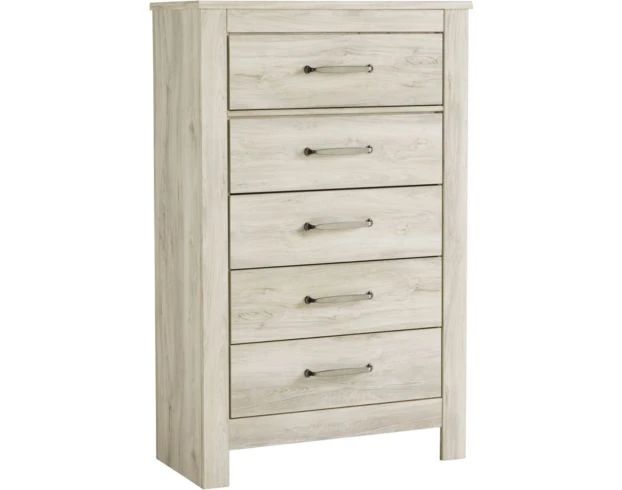 Express your farmhouse style with this cozy chest. It features brushed nickel-tone handles, five spacious drawers with lined faux linen laminate, and side roller glides for smooth operating drawers. The chest’s wispy white finish over replicated oak wood grain adds to its unique charm.
