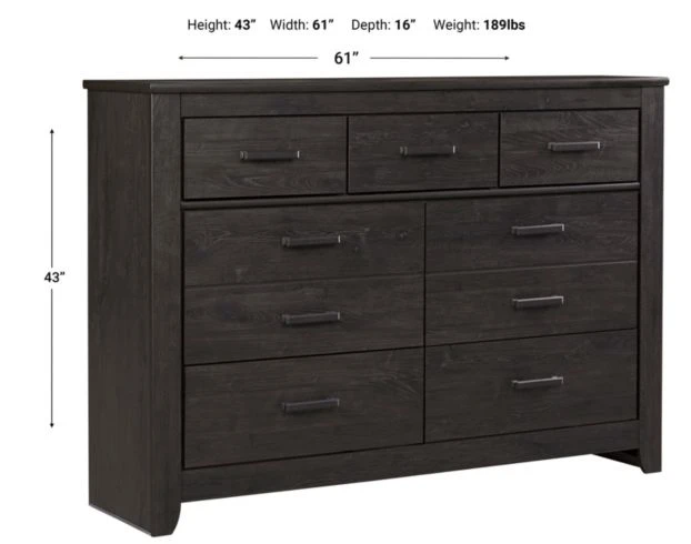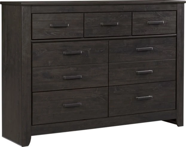 Enjoy relaxed style at a great price with this dresser. It features a clean-lined, contemporary profile and seven spacious drawers of varying sizes with smooth roller glides and linear metal hardware. The dark, charcoal finish lends a sleek touch to any casual setting.