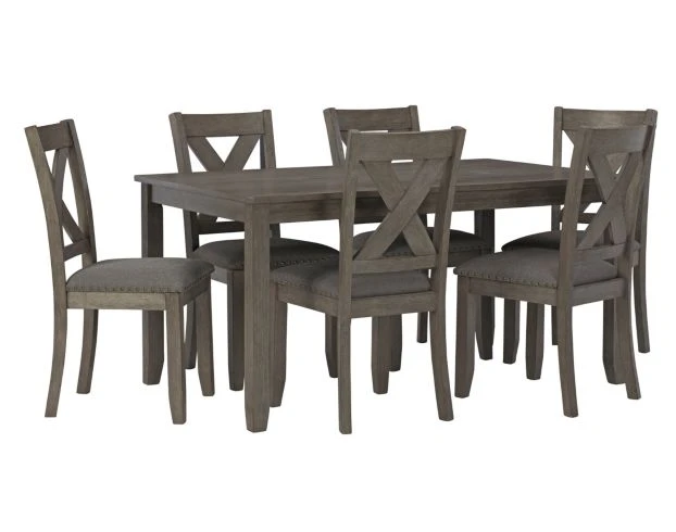 Enjoy dining in style with this seven-piece dining set. It includes six side chairs with an x-back design, an upholstered seat with nailhead accents, and a rectangular dining table. The antique gray finish adds cool sensibility to a casually designed interior.