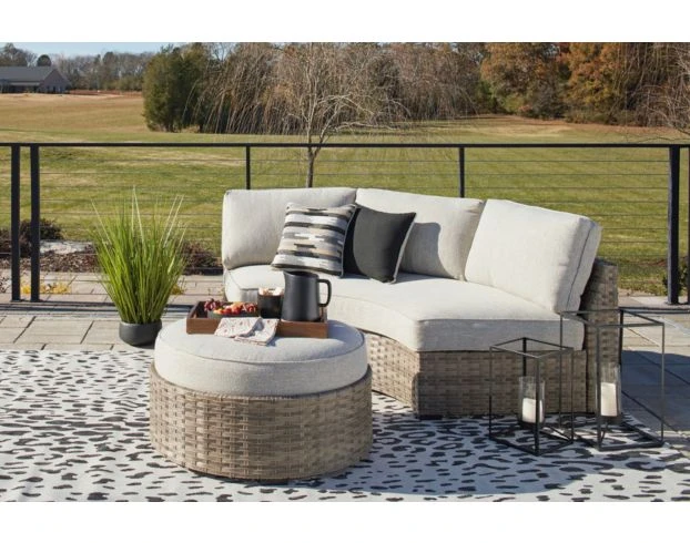 Kick back and relax with this comfortable and casual round ottoman made of hand-woven wicker that’s built to last through all the seasons of weather. Its round shape and durable Nuvella ® wrapped cushion make for a graceful addition to any porch or patio space and can be used on its own or as a complementary piece to a matching loveseat.
