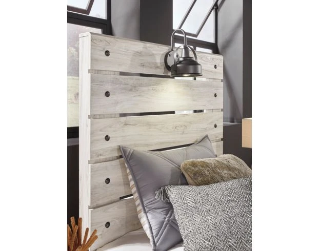 Rustic farmhouse and industrial style combine with the Cambeck collection. This impressive full size panel headboard features a battery-powered sconce light and USB plug-ins, making this headboard perfect for reading in bed. The wispy whitewash finish is ideal for any rustic color palette.