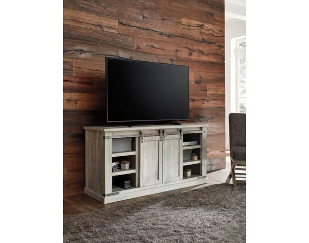 Not only is the Ashley Carynhurst 60-Inch White Media Console designed with functionality in mind, it is also enriched in brilliant style. This piece features two adjustable shelves, four side shelves, a pair of sliding barn door, and cutouts for wire management. Its whitewash finish is accented with gray metal brackets and hardware. Suitable for a 60-inch TV, this piece would make the perfect addition to any rec room, den, or living space!