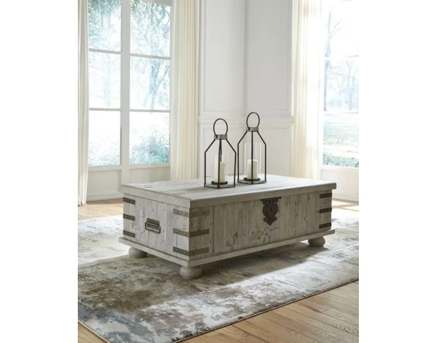 Add country-inspired charm to your home with this quaint coffee table. Designed like an antique storage trunk, it offers storage space beneath a lift top that also provides a work space. The distressed finish, recessed bun feet and metal hardware are the finishing touches on an easy addition to any space. LOC: 11G