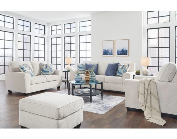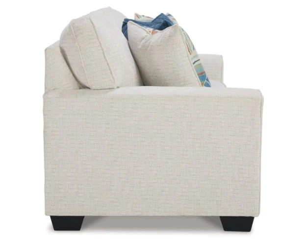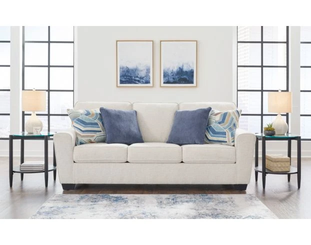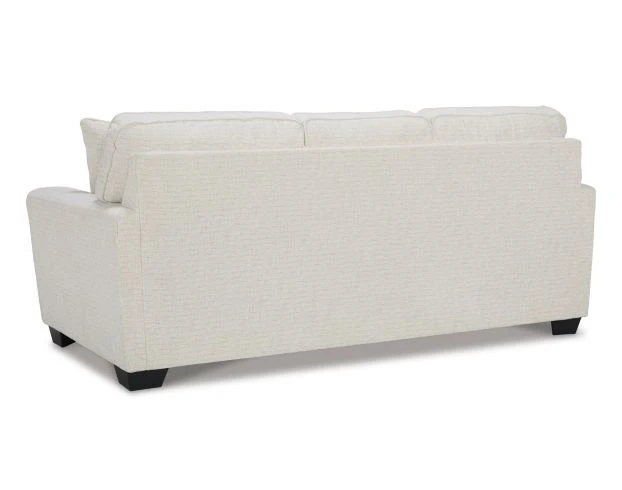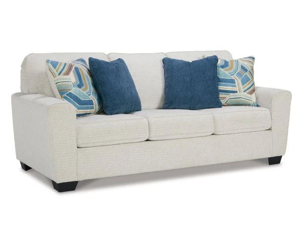 Liven up your living room with the contemporary Cashton sofa. A chunky silhouette holds invitingly ample cushioning you’ll long to lounge in. It features track arms, block feet and a cushioned back. The crosshatched white polyester fabric and four accent pillows create a delightfully visual texture that’s perfect for any space.