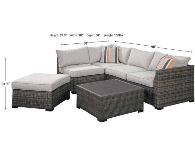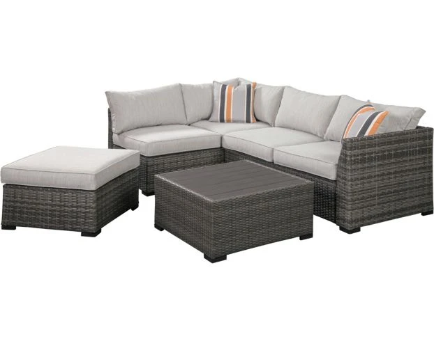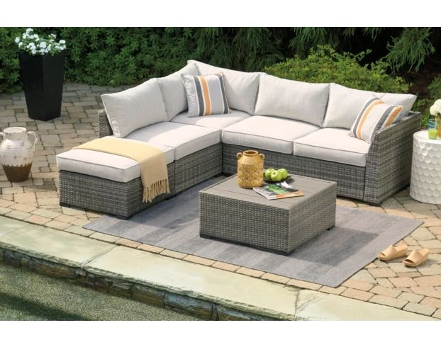 Lounge and relax outdoors with the Ashley Cherry Point Sectional with Ottoman and Table which features an aluminum frame to resist rust. Wrapped in high-performance Nuvella fabric, the cushions are comfortable yet carefree. The light gray hue with included pillows are an easy addition to your outdoor space.