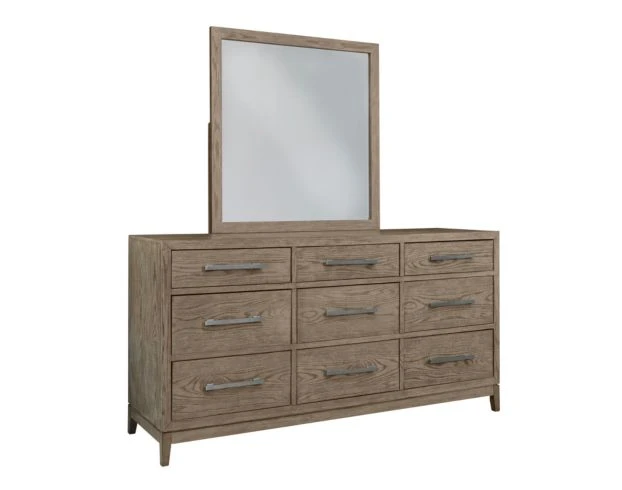 The simple silhouette of this contemporary dresser with a mirror opens the door to a bedroom with the curated look and subtle flair you desire. Striking metal bar pulls in a light pewter tone are functionally fashionable against the piece’s elegant waxy gray finish. Ample drawer space allows you to store in streamlined style.