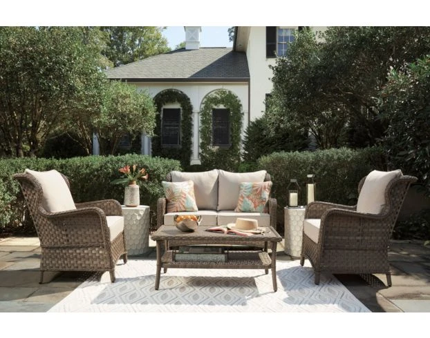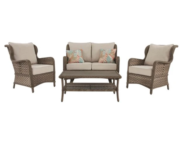 Make your patio complete with this Ashley Clear Ridge four-piece patio set. It features a loveseat, two chairs and a cocktail table. This set is crafted of all-weather wicker and Nuvella® fabric, providing an eco-friendly and durable solution for the outdoor elements.