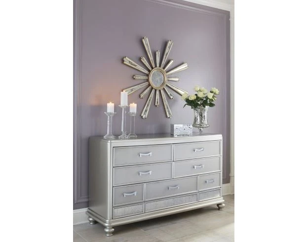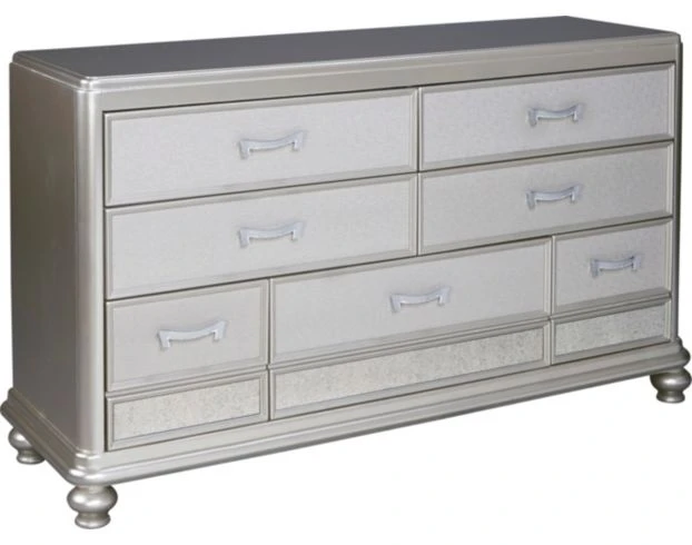 Add old-world elegance to your home with this dresser. It features hardwood construction, bun feet and seven spacious drawers with dovetail joinery and ball bearing glides. The shimmering silver finish and unique hardware add grandeur to any space.