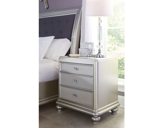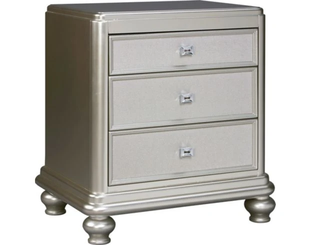 Add old-world elegance to your home with this nightstand. It features hardwood construction, bun feet and three drawers with dovetail joinery and ball bearing glides. The shimmering silver finish and unique hardware add grandeur to any space.