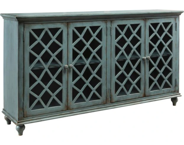 Casual form and function combine with this charming accent cabinet. The relaxed design offers plenty of space for storage and display, including a wide top and four glass-paned doors that reveal adjustable shelving. The slate finish highlights the lattice details and complements any color palette.