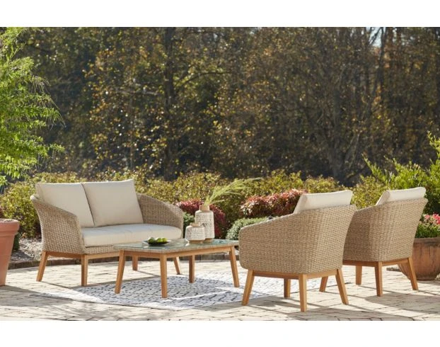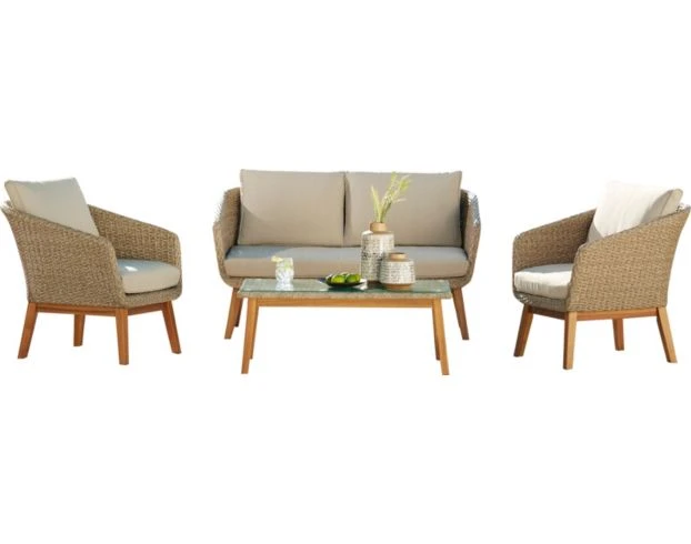 This four-piece patio set is just what you need to enjoy the outdoors. The table features a tempered glass top, while the loveseat and two chairs features all-weather cushions and woven resin wicker for outstanding durability. The clean lines and beautiful acacia wood are sure to make this set stand out in your space.