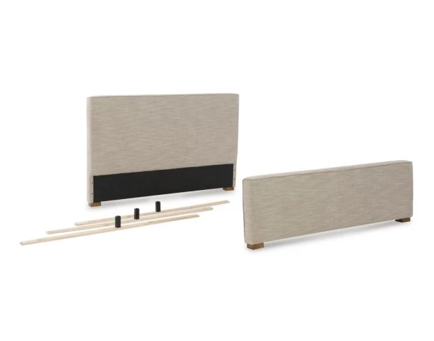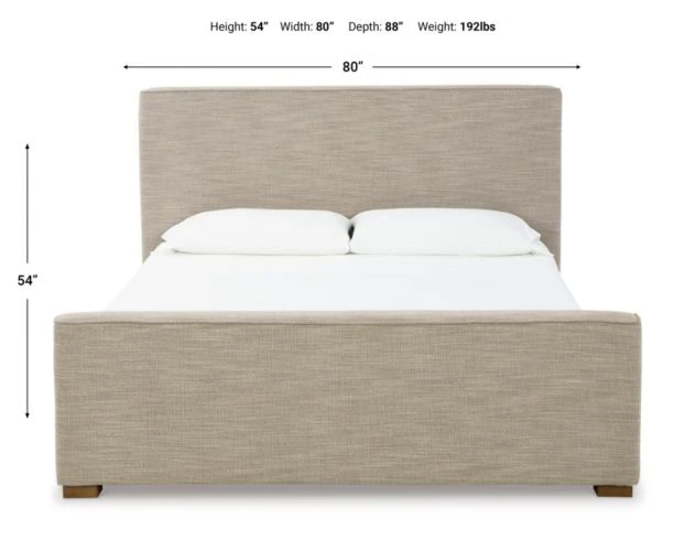 The Dakmore king bed offers casual lifestyle design with a modern vibe. Its simple design offers a sleek silhouette in a clear natural looking finish. This modern styled upholstered bed features thick, clean-lined headboard and footboard panels covered with a casual linen-like polyester fabric.