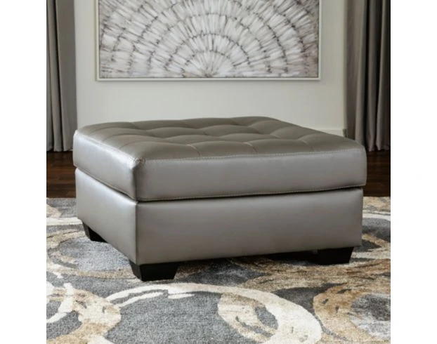 Dressed in glorious gray faux leather, this oversized accent ottoman is certain to be the center of attention. With a tastefully simple design, it adds style and comfort underfoot. This versatile companion piece has a generous scale that lets you share the space with family or use it for entertaining when friends drop in. LOC: 8I