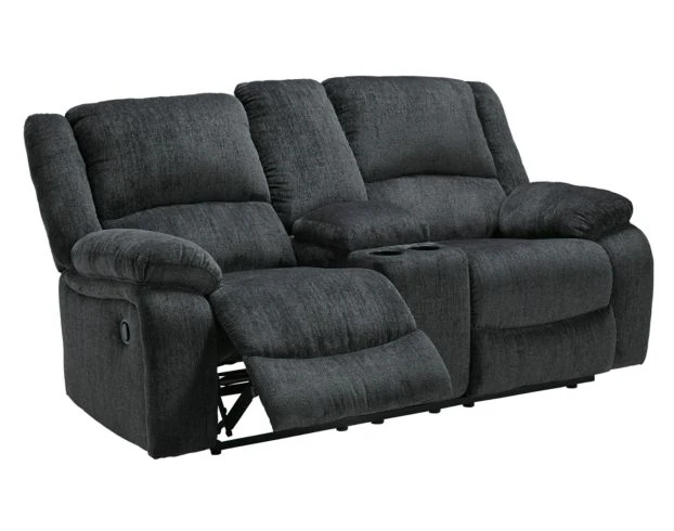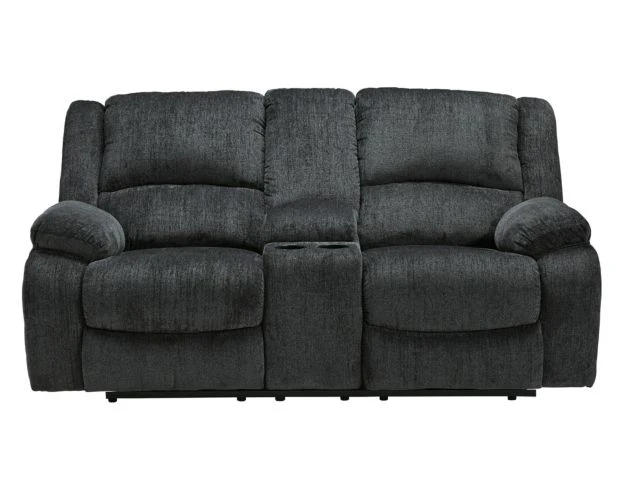 The Ashley Draycoll Slate Reclining Loveseat with Console features a reclining mechanism, middle console, and high cushion density so you can kick back an enjoy luxury in your own home. A loveseat couldn’t get more inviting than this. Its slate hue and spacious design make this the perfect entertaining seating to make movie night a lot more fun. LOC: 0