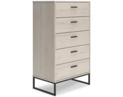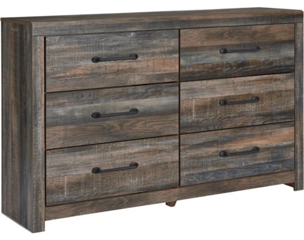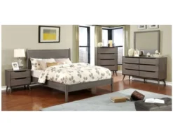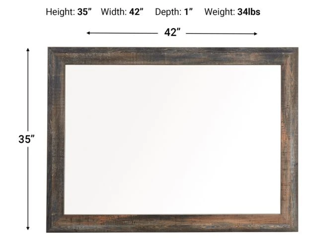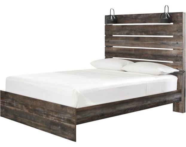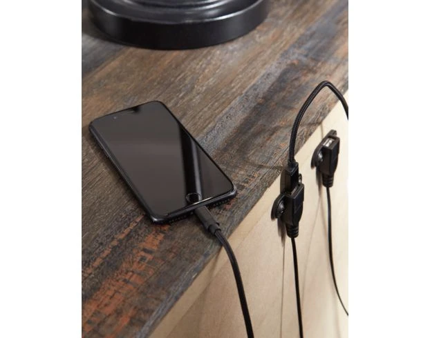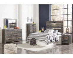 Rustic and industrial design combine with this unique king size bedroom set. A refined take on barn house decor, its detailed replicated wood grain showcases hints of burnt orange and teal tones, creating a sense of authenticity. You’ll be able to enjoy reading in bed even more with its retro-chic light sconces and USB outlets. The set includes a kings size bed, dresser, mirror and nightstand.
