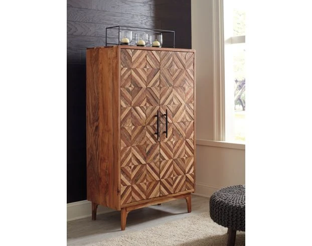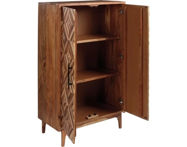 Bold furniture like this accent cabinet are great for highlighting your interior. This piece offers two cabinet doors with diamond inlay pattern door fronts and two shelves. The elongated design is dressed with a blend of light and medium brown finishes for a contemporary look. LOC 3F, 2F