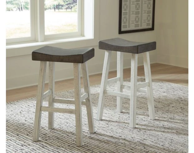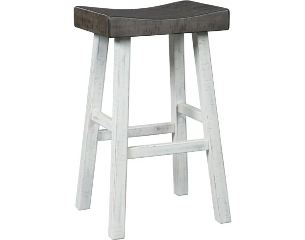 Add the Ashley Glosco White Barstool to your dining space. It features a saddle seat with a rustic gray finish complemented by distressed, white legs. Relish in its perfect height for your breakfast bar or dining table.
