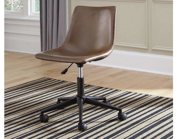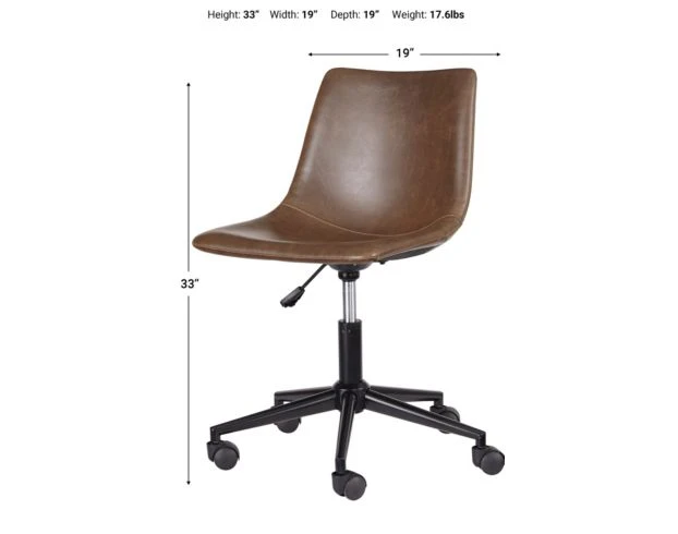 Comfort and chic style combine with this handsome desk chair. It features adjustable height and tilt features, a metal base in a black finish, smooth swivel and casters for easy mobility. The bucket style seat is wrapped in vintage brown faux-leather, creating a sophisticated yet casual look perfect for your home office.