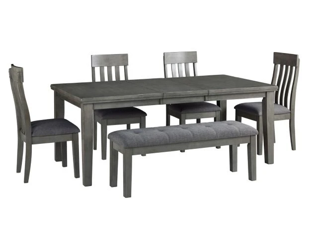 Explore contemporary styling in your home with this fabulous six-piece dining set. Stacked with chic features, this set includes four side chairs with a slat-back design, a bench with a soft upholstery seat, plus a dining table with a self-storing butterfly leaf construction for extra seating space. The minimal silhouette and sleek gray finish gives your dining space a style stamp of approval.