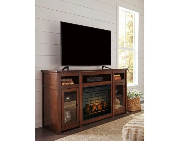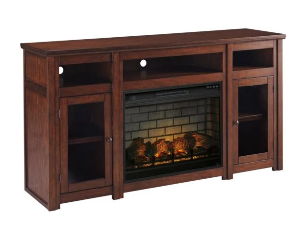 Welcome this TV stand and fireplace into your home for the perfect multifunctional addition. It features an optional fireplace insert in the center, plus three adjustable shelves, two glass-front cabinet doors, and a convenient wire management system. The mango veneers complete this piece and provide a rich earthy tone that will suit any traditional space.