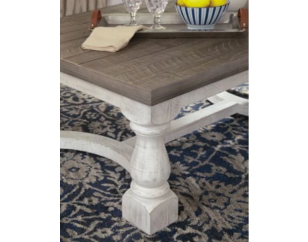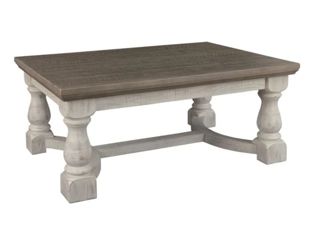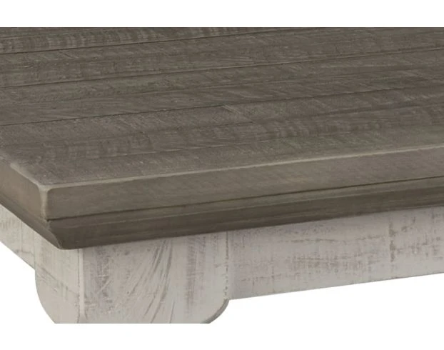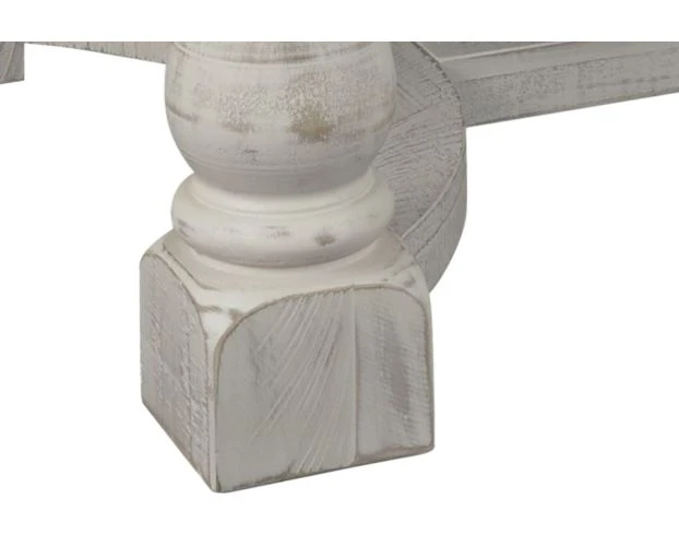 Bring distressed style into your home with this cocktail table. It features robust legs with superb detailing and a sturdy top. The two-toned look of weathered gray with vintage white is sure to give fantastic farmhouse vibes to your space. LOC: 3C,6F