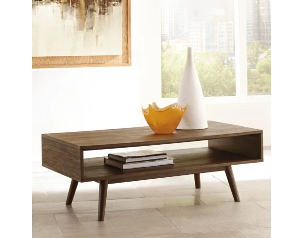 Add a touch of mid-century appeal to your home with this coffee table, constructed of Acacia solids and veneers. Its sleek lines and open storage area make this the perfect combination of style and function. You’ll create an inviting look and feel with the brushed brown finish and retro peg legs. LOC:7D, 10E