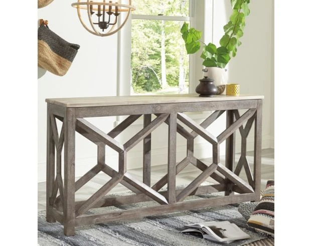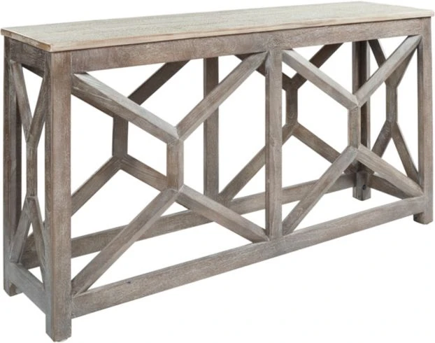 This console table would look great in your entryway or behind your sofa. Crafted from wood, this piece features a chic, sculptural base and a whitewash and antique gray finish. Complement your interior with this console table.