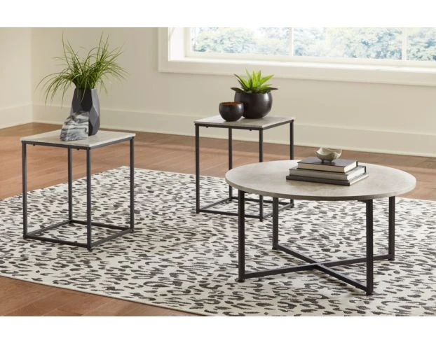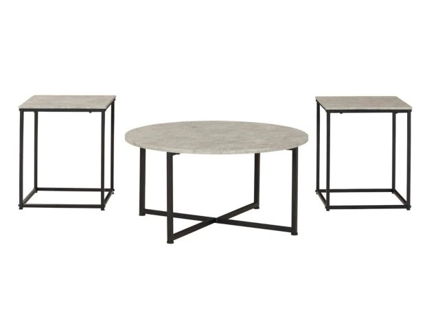 No matter your style, this coffee table and two end tables are sure to be a great addition to your home. The faux concrete top is paired with a tubular metal base in a dark metallic powder coated finish, for a striking simple chic look. LOC:9I