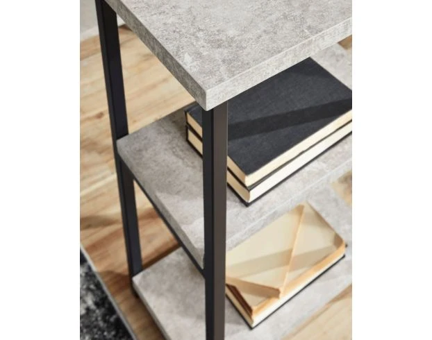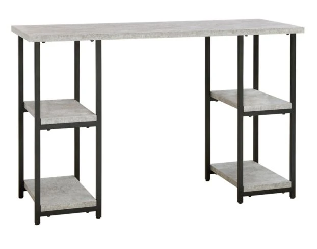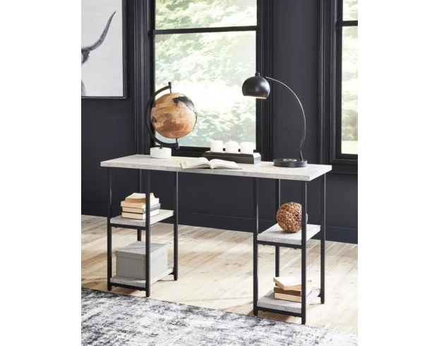 The casual linear style of this Ashley Lazabon desk is ideal to keep your home office aesthetic appealing and clean. It features an architectural look with its faux concrete melamine top and a metal base in a dark pewter-tone finish for the perfect balance of crisp and cool. The double-shelf pedestal design offers plenty of storage space, and the melamine top resembles wood grain but offers kid-friendly durability.