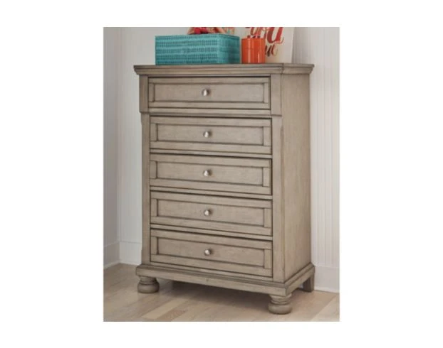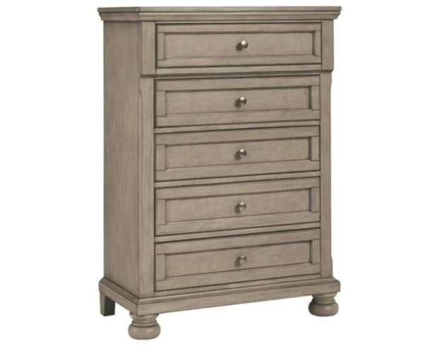 Add sleek style to your bedroom with the Ashley Lettner Chest. It features five drawers, English dovetail construction, ball-bearing glides, and knob hardware. The medium wood hue will complement any neutral-color palette.