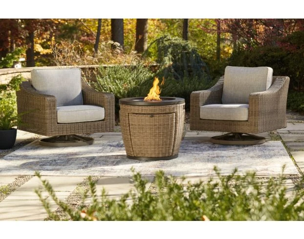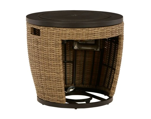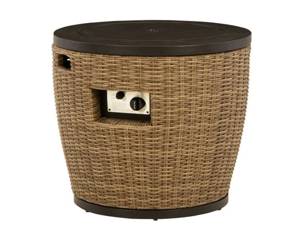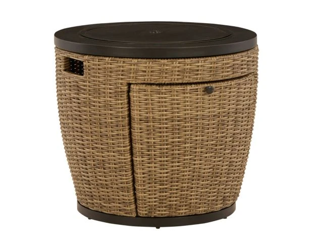 Warm up your patio space with the Ashley Malayah Fire Pit. Constructed of all weather wicker, this statement piece will last for years to come. Constructed of all-weather resin wicker, this gas firepit can double as a table. The stainless-steel burner contains glass beads that add a unique element of shine to the set. It also comes with an all-weather polyester cover.