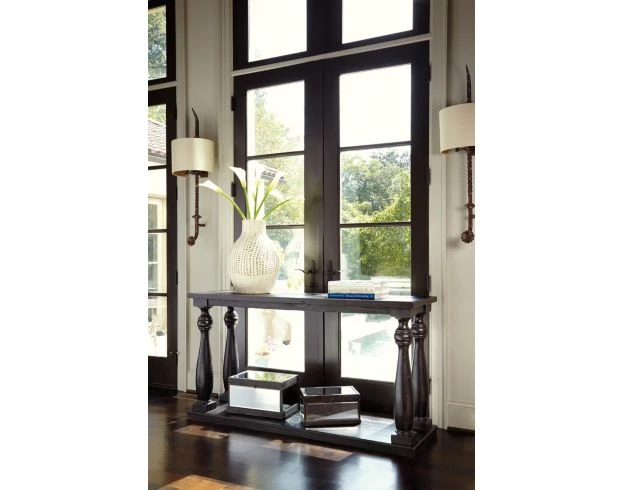 Offering plenty of classic form and function, this handsome sofa table features a generous top and a spacious shelf, ideal for storage and display. The rich black finish showcases the turned legs, planked design and wire-brushed details, creating a look that suits any space. LOC: 6H