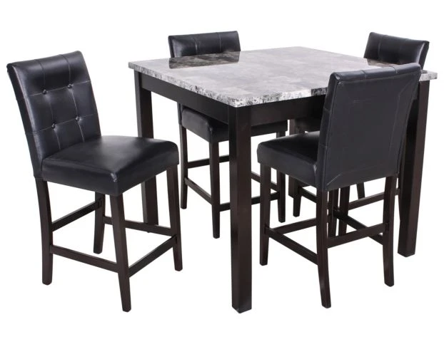 Add sophisticated style to any dining or entertaining space with this gorgeous, five-piece set , which includes a beautiful counter table and four stools. The table features clean, classic lines and a realistic, faux marble top. The stylish stools feature plush, tufted seats and backs covered with durable faux leather. The set’s chic, black finish complements any color palette. Additional features include: black finish, polyurethane, faux marble. LOC:8I