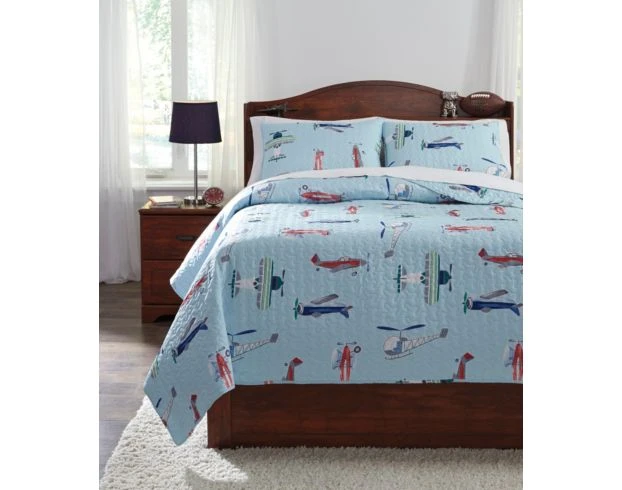 Create a fun youth bedroom with this stylish, three-piece bedding collection. It includes a full-sized quilt and two matching pillow shams with bright colors and a mix of airplane and helicopter motifs.
