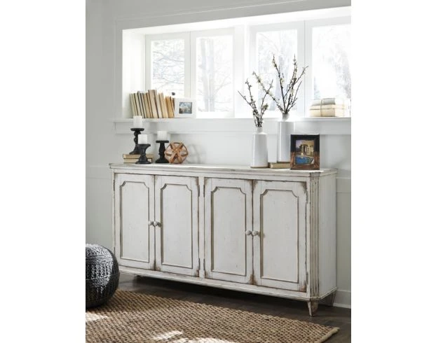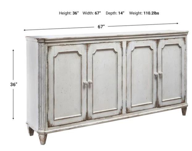 Casual form and function combine with this beautiful accent chest. The charming design offers ample space for storage and display, including a wide top and four doors that open to reveal adjustable shelving. The distressed white finish showcases the clean lines and French provincial molding, creating a stylish look.LOC 2F