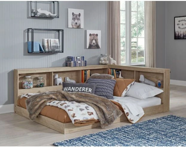 This full-sized bookcase storage bed brings big style to small living areas. It features open cubbies to place items, plus a low-profile bed. Topped with a natural wood tone finish with replicated oak grain texture to complement your interior palette.