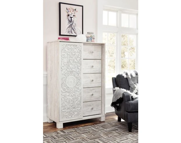 The Ashley Paxberry Dressing Chest is the perfect mix of style and versatility for any bedroom. This artistic piece includes a sliding door featuring a beautifully carved design, five drawer chest, and additional shelves for the ultimate storage space. The charming whitewash finish is a must-have that will complement any traditional space.