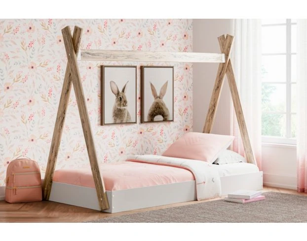 Bedtime just got a whole lot more fun! This twin-sized tent bed is the perfect addition to your kids bedroom. It offers a two-tone look with its solid matte white finish and replicated sugarberry wood grain pattern. Give your kids bedroom a functional yet stylish piece to make every night an adventure!